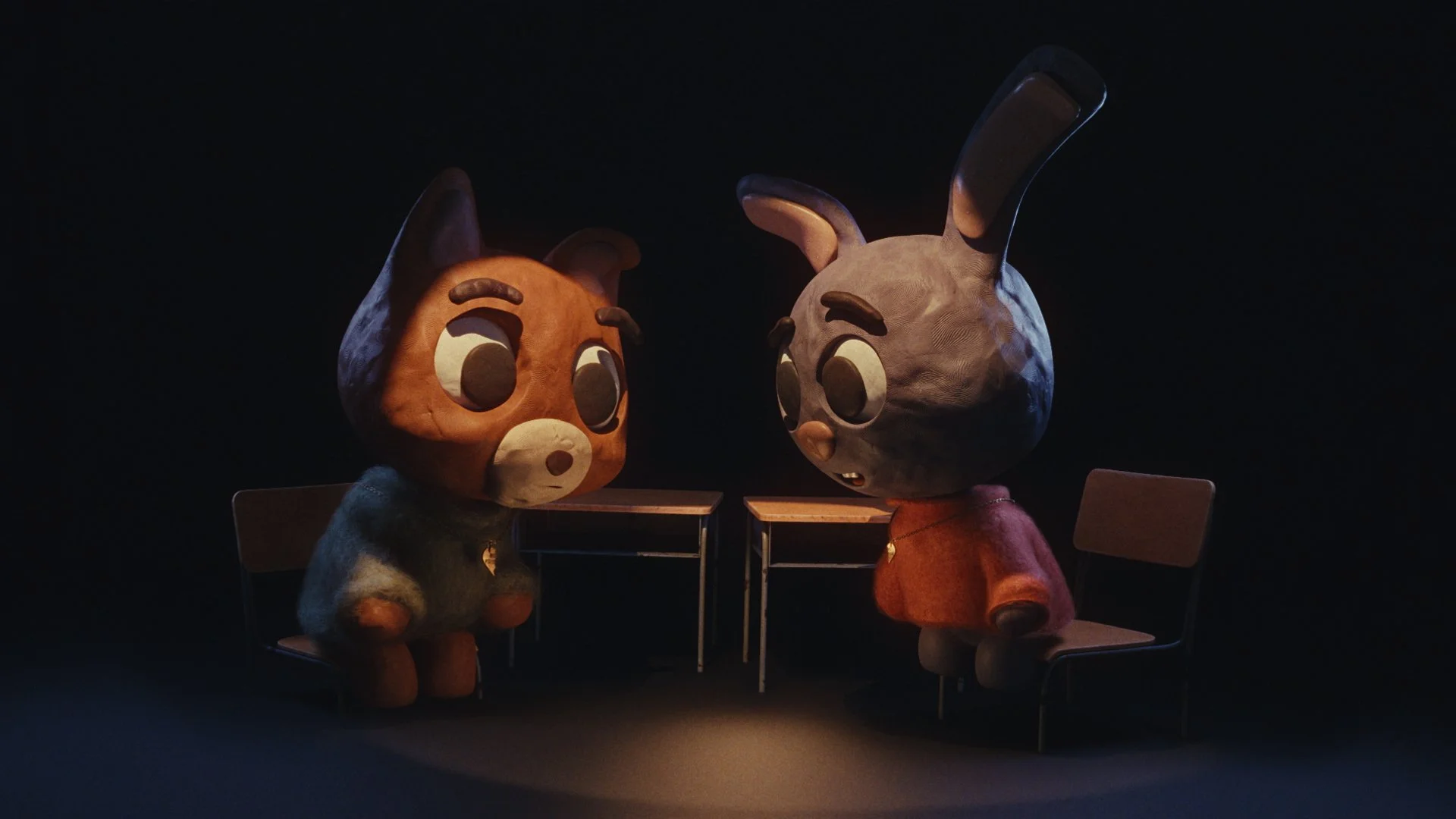 The two clay characters at the center of writer/director Courtney Sposato’s Staring Contest are a cute little bunny and a fox. They’re the best of friends, as proven by their matching Best Friends lockets, and they’re in the middle of a staring contest. It’s interrupted, and then their world is upended.